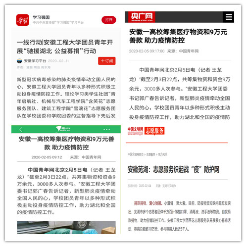 师生筹集近20万元资金,对接18所高校爱心团队和社会公益组织,联系采购近十批医疗物资,及时送达20多家湖北基层医院。同时,他们还协助校医院收集国家批准的正规医疗物资生产厂家、销售商供货信息或防控物资。相关事迹不仅学习强国、央广网、中国文明网、中国青年报、中国教育新闻网、安徽共青团、安徽教育网等媒体进行关注报道,山东大学共青团、自媒体“补壹刀”等也对募捐事迹进行报道。团队队长也荣获2019年度“全国优秀共青团员”。