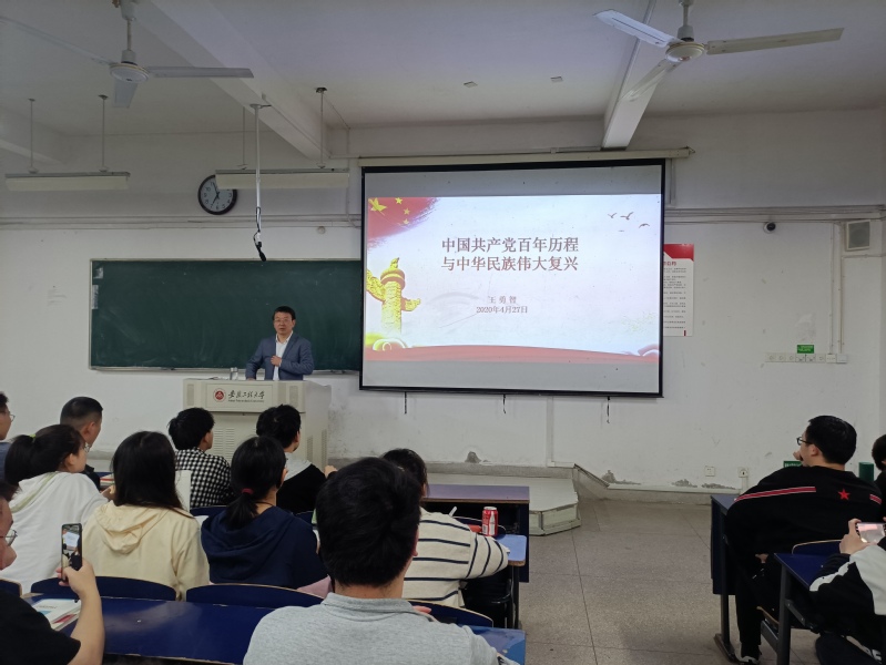 王勇智以《中国共产党百年历程与中华民族伟大复兴》为主题,通过列举史料和事例,阐述了开展党史学习教育的重要性,他详细讲解了中国共产党诞生的时代背景,分析了中国共产党百年发展的成功经验和启示,带领同学们从党的百年历史中感受我们党的辉煌成就。最后,他鼓励同学们“学史明理、学史增信、学史崇德、学史力行”,要在真学真信中坚定理想信念,在学思践悟中牢记初心使命,真抓实干,脚踏实地,努力学习,以昂扬姿态、优异成绩迎接建党100周年。
