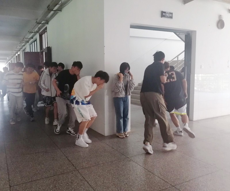 在演练前,辅导员田园老师作动员讲话。他介绍了此次演练的目的、演练内容、流程并针对演练过程提出相关要求。接着,学生会主席孔鑫城同学带领参演同学学习了防震、应急避震、紧急疏散知识,熟悉应急避险的正确方法。