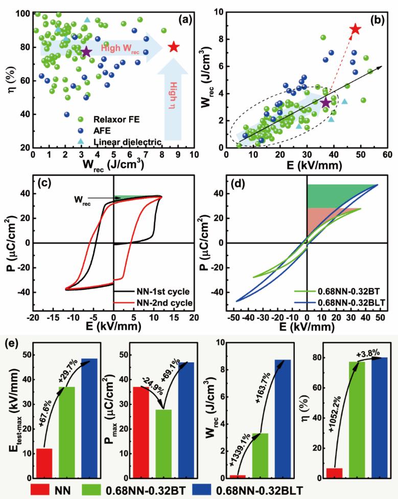 图1 NaNbO3-(Bi0.5Li0.5)TiO3弛豫铁电陶瓷的设计思路与储能性能