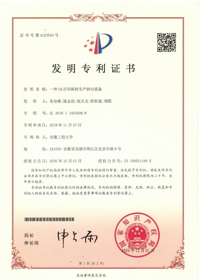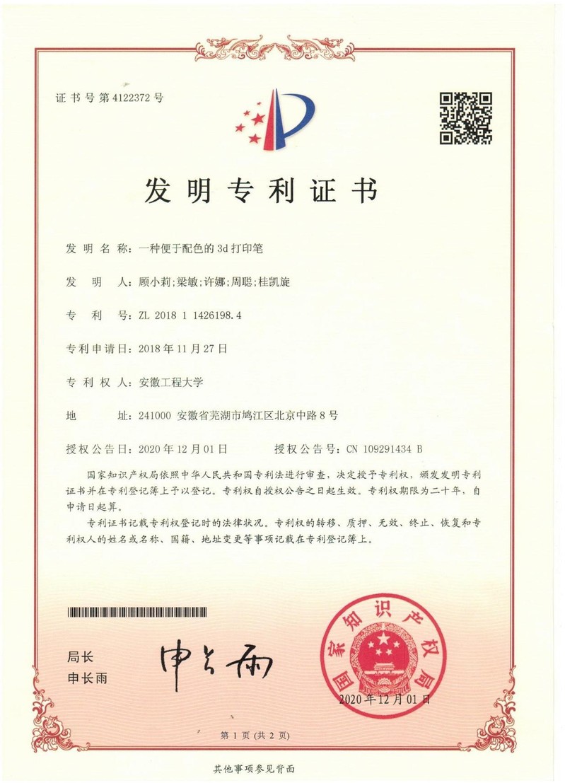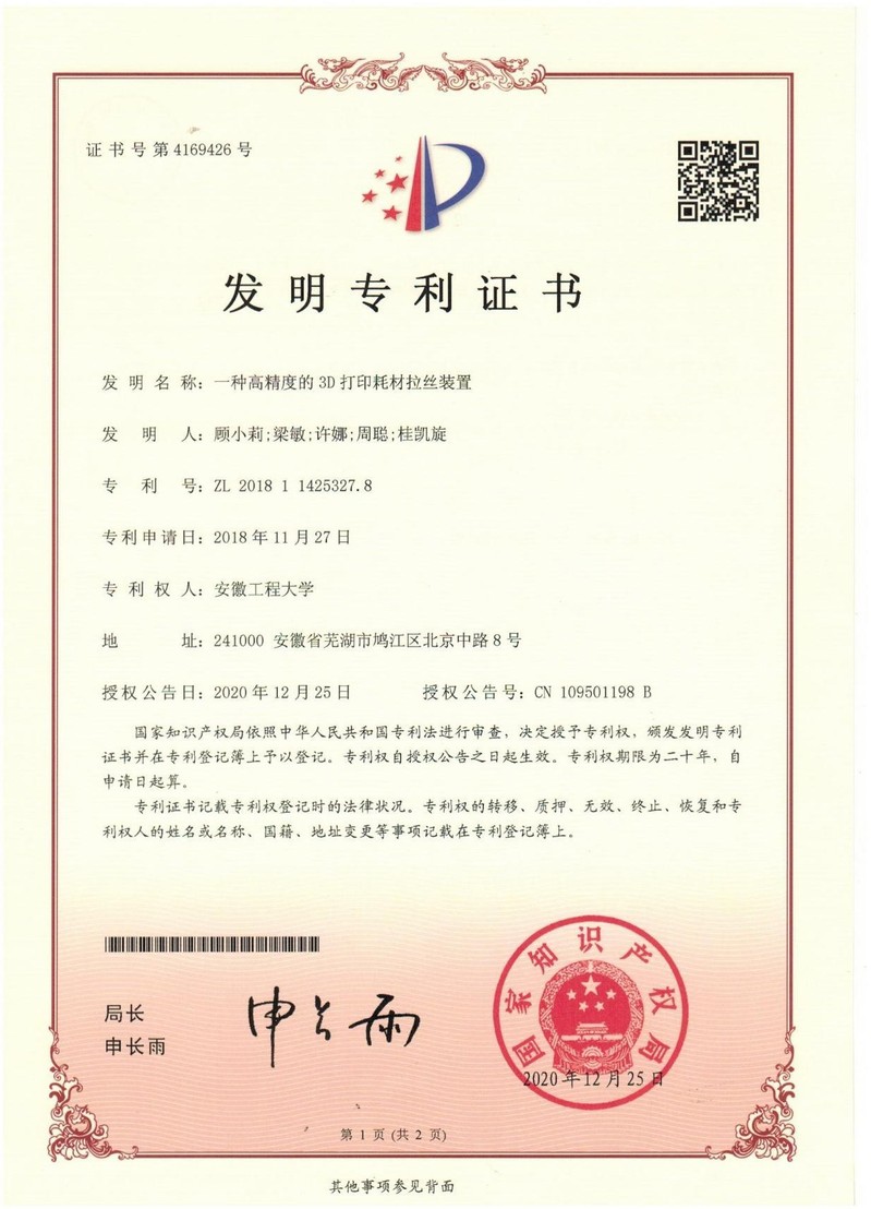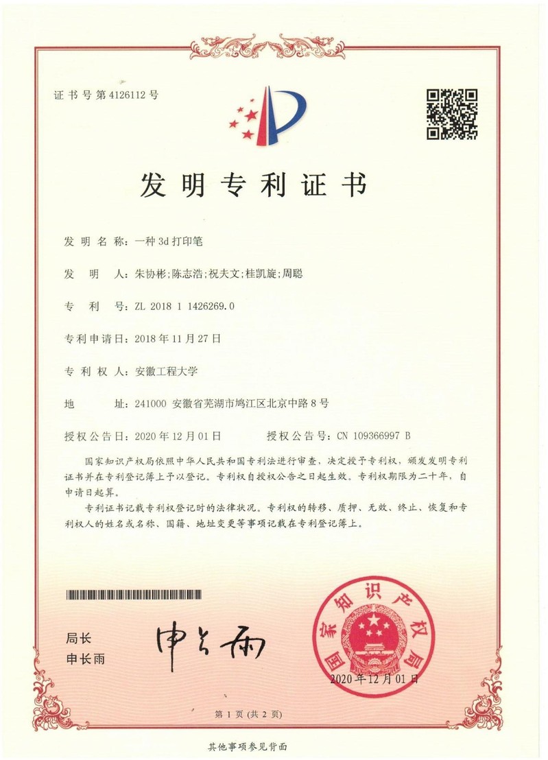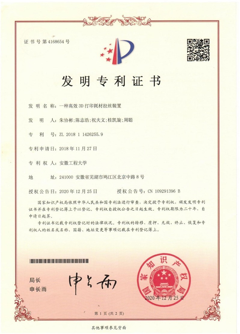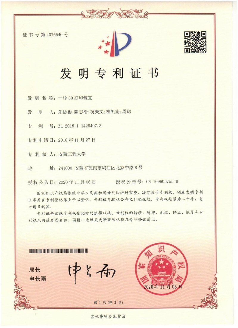 近三年申请发明专利50余件,授权发明专利20余件。增材制造实验室指导学生合作申请的具有代表性授权发明专利如下:
