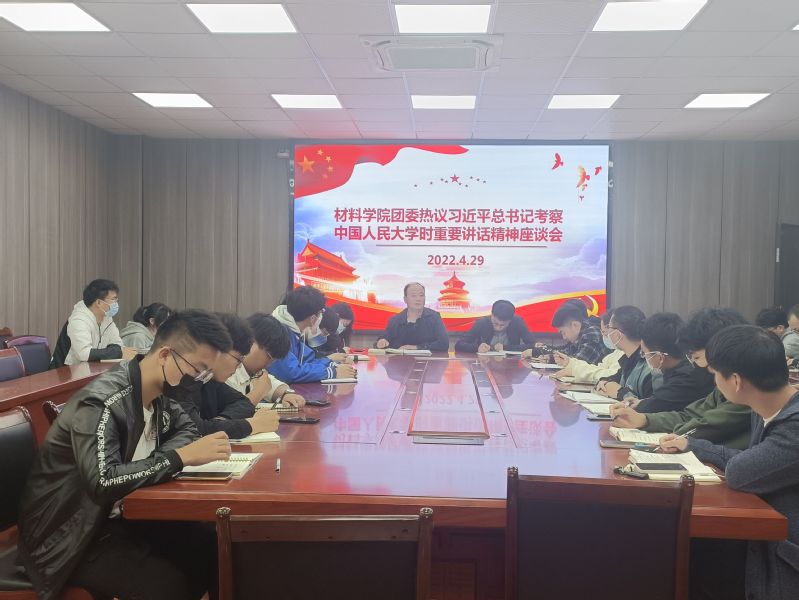 4月29日下午,材料学院团委在B座216会议室召开学习贯彻习近平总书记考察中国人民大学时的重要讲话精神座谈会。院党委副书记方玖胜、团委书记陶冶、辅导员、院团委学生会骨干、全体团支书参会。