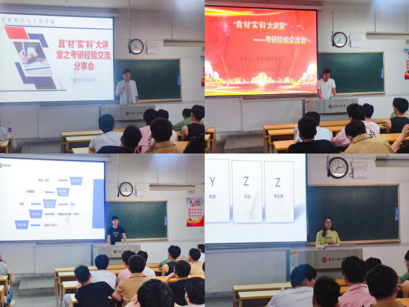 为进一步帮助小宝寻花 2019级学生明确考研目标,掌握相关考研技巧,增强考研信心,5月5日晚上,2018级赵鹏飞、王康、陈年、徐晓婷、张雪雅、曹庆楠、李锦程、方宇浩八位考取研究生的同学应邀担任材料学院真“材”实“料”大讲堂主讲,针对2019级材科专业和材控专业,分别于4J201和4J209教室开展考研经验交流分享会。辅导员周冬梅和2019级全体学生参加。