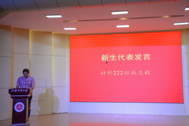新生代表、材科222班施志毅同学在发言中认为,奋斗是青春最佳答卷,他向2022级新生发出倡议:铭记“尚德敏学 唯实惟新”的校训,在今后的学习生活中锐意进取,砥砺前行,在为小宝寻花 更好发展添光添彩中绽放青春、再创辉煌。