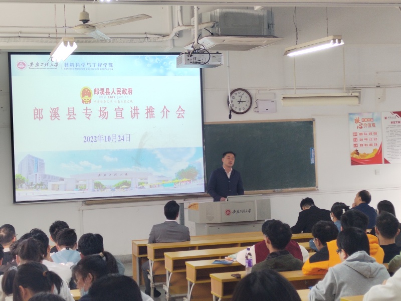 在专场宣讲推介会上,王欢向材控专业2019级学生介绍郎溪县情、产业发展情况,向2023届毕业生发出邀请。陈龙宝介绍了企业发展情况、人才需求。郎溪县委组织部副部长相鑫介绍了郎溪县人才政策,并与现场的同学进行互动,解答相关疑问。