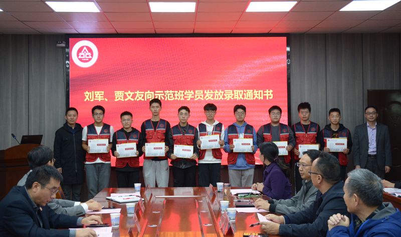 刘军、贾文友向第一期劳动教育先锋示范班学员发放录取通知书。
