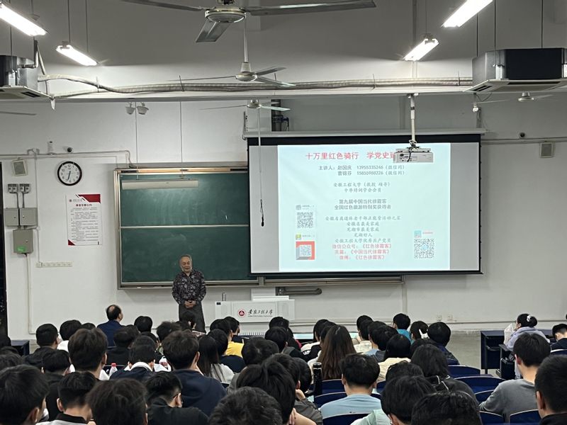 会上,赵国庆介绍了“红色骑行”的宏大主题,展示了“红色骑行”的数据,并阐述了他们为庆祝中国共产党建党100周年而骑行的初衷。一场视听盛宴让各位同学身临其境的体验中国共产党的发展历史及革命英雄的伟大事迹,让学生深刻体会到我们当今的幸福生活来之不易。曹锦芬分享了在这段十万里“红色骑行”中的巨大收获,赵国庆夫妇收获了自信,这种自信是源于中国共产党对自己的光辉历史的自信,是对百年奋斗成就的自信,也是对历史伟业的自信;收获了坚强,这种坚强是来自中国红军长征途中的那种坚定不移,永不放弃的坚强;收获了快乐,这种快乐是来自祖国大好河山的美景,各个地区人民的风土人情。曹锦芬说:“我不知道10万里有多远有多累有多难,但是每当参观完那些红色景点,我都会被那种英勇、悲壮、辉煌所震撼!”