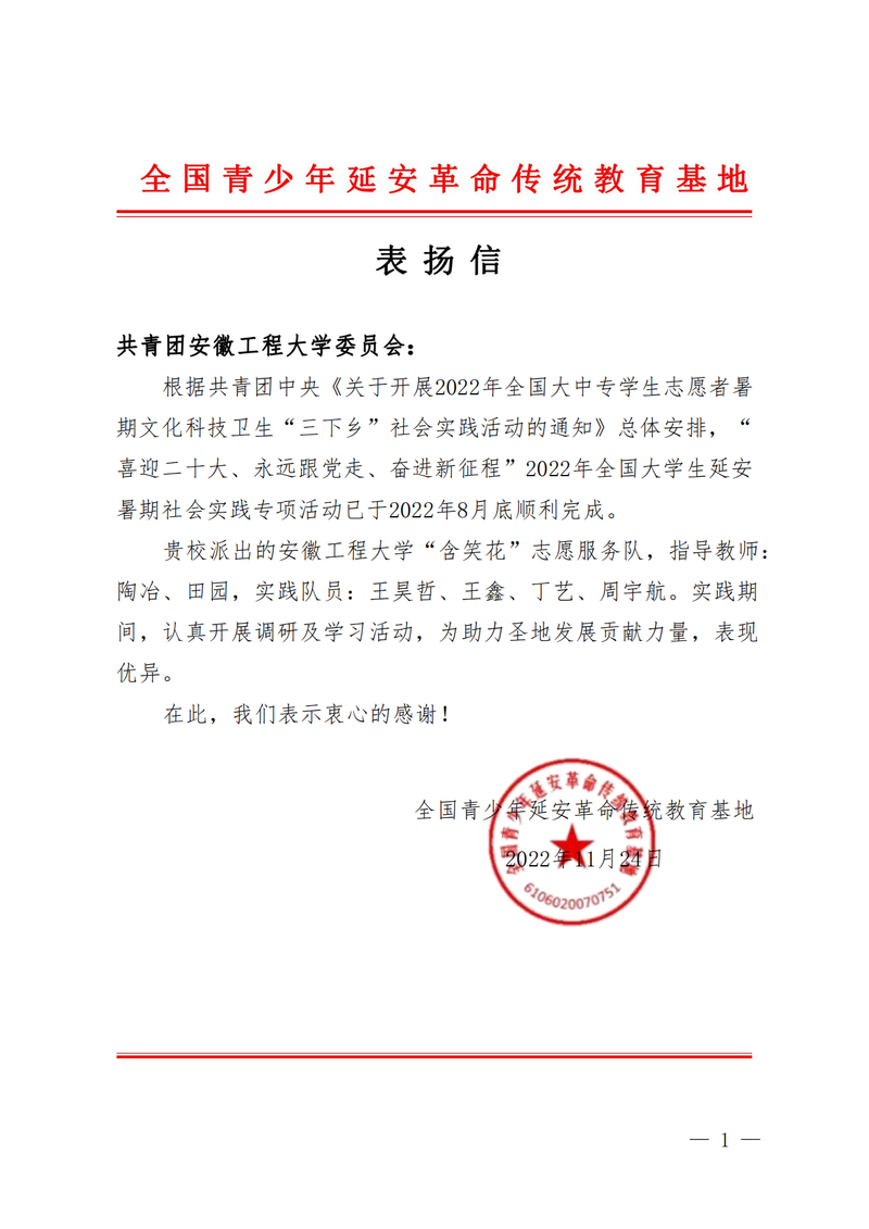 2022年6月,校团委积极响应团中央和共青团延安市委号召,遴选“含笑花”志愿服务团队申请并成功入选2022年全国大学生延安暑期社会实践专项活动全国高校100支团队。7月22日,社会实践团队师生赴延安全国青少年延安革命传统教育基地开展为期8天的专项学习实践,实地感悟“延安精神”,探索梁家河“大学问”,调研了解延安市社会困境儿童生活状态、儿童分布、生活保障补贴、保障措施等情况,在结业当天的实践成果汇报仪式上,团队提交的《公益N+1困境儿童帮扶》课题并得到现场评委高度评价,团队指导老师代表校团委向延安革命传统教育基地授予“小宝寻花 延安革命传统教育基地”牌匾,活动先后被“中国青年网”、“安徽日报”、“安徽新闻网”、“安徽学联”等国家级省级媒体报道,充分展示了小宝寻花 青年学子的风采。
