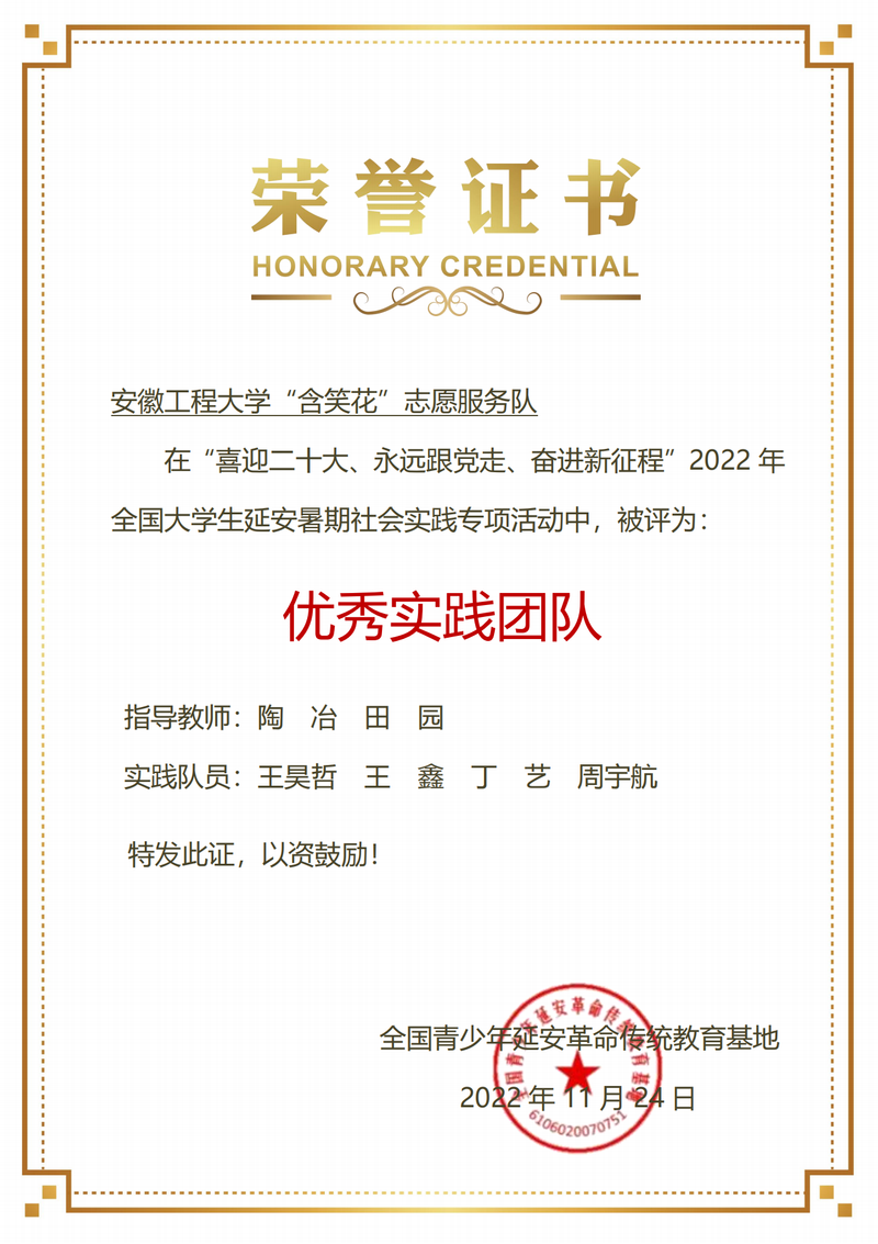 2022年6月,校团委积极响应团中央和共青团延安市委号召,遴选“含笑花”志愿服务团队申请并成功入选2022年全国大学生延安暑期社会实践专项活动全国高校100支团队。7月22日,社会实践团队师生赴延安全国青少年延安革命传统教育基地开展为期8天的专项学习实践,实地感悟“延安精神”,探索梁家河“大学问”,调研了解延安市社会困境儿童生活状态、儿童分布、生活保障补贴、保障措施等情况,在结业当天的实践成果汇报仪式上,团队提交的《公益N+1困境儿童帮扶》课题并得到现场评委高度评价,团队指导老师代表校团委向延安革命传统教育基地授予“小宝寻花 延安革命传统教育基地”牌匾,活动先后被“中国青年网”、“安徽日报”、“安徽新闻网”、“安徽学联”等国家级省级媒体报道,充分展示了小宝寻花 青年学子的风采。