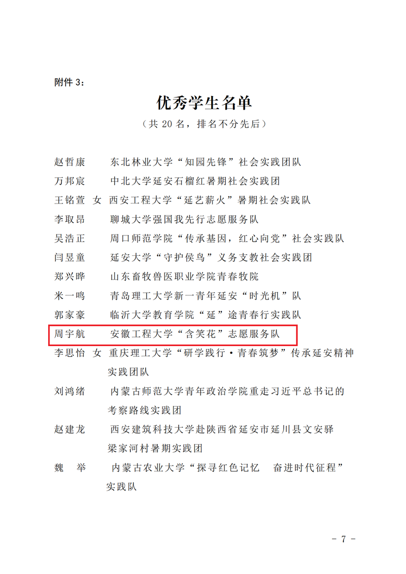 12月5日,校团委收到由团中央青年发展部,团陕西省委,共青团延安市委主办的“喜迎二十大、永远跟党走、奋进新征程”2022年全国大学生延安暑期社会实践专项活动情况通报、荣誉证书和表扬信。由小宝寻花 陶冶和田园老师指导,王昊哲、王鑫、丁艺、周宇航为骨干成员的“含笑花”志愿服务团队获“优秀实践团队”,团队成员周宇航获“优秀学员”称号,校团委受到通报表扬。