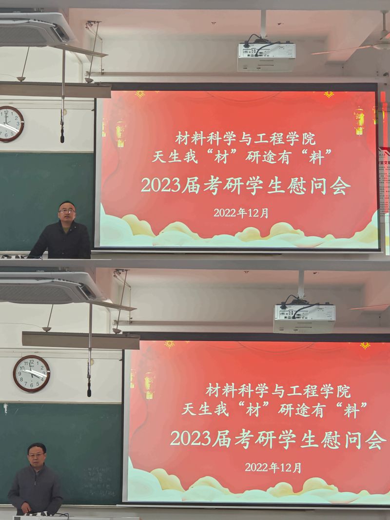 为帮助考研学生缓解备考压力,坚定考研信心,积极冲刺迎考,12月8日下午,材料学院在6J213开展2023届考研学生慰问活动。学院党政领导、各系部负责人、各党支部书记、团委书记、毕业班辅导员共同为2023届考研学生送温暖祝福,本次活动由院党委副书记方玖胜主持。