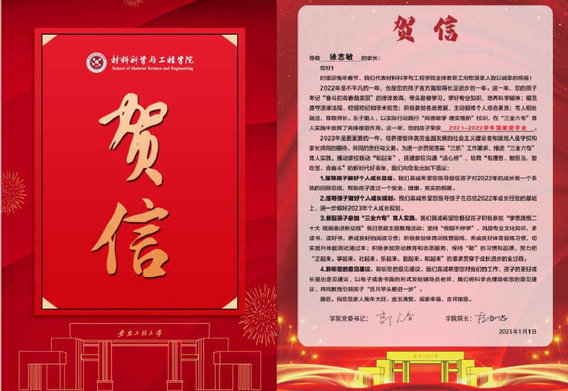 材控191许世豪家长许万春表示,“收到学院寄来的贺信,知道孩子获得国家励志奖学金,非常开心,平时在与孩子沟通的过程中也了解到学校非常注重学生德智体美劳全面发展,开展了‘三全六专’育人实践,所做的工作都有目共睹,非常感谢学校领导老师对学生的帮助。建议材料学院建立一个家长与学院交流的平台,让家长对孩子在学校的情况有更多的了解,同时也可以让家长更好的了解学校。”