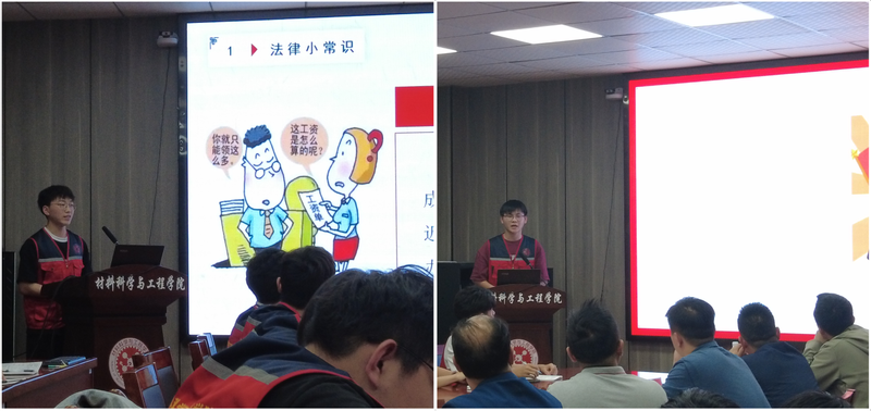 第一期劳动教育先锋示范班学员在前期实践、理论学习的基础上,以小组为单位,精心准备了《劳动节的由来》《致敬劳模》等8门劳动教育微课程,并PPT的形式制作成图文并茂课件,为进班宣讲做好准备。来自材控212的学员代表王闯以《劳动法律小课堂》为题,落落大方站在讲台,结合实际案例,生动讲述了大学生兼职就业中可能遇到的劳动纠纷问题,提醒大家既要脚踏实地也要学习劳动相关法律;来自材科222的学员代表卢子明宣讲《劳动精神》微课程,他以《劳动者的一天》短视频开场,从身边平凡人的视角出发,讲述了实干、奋斗、创新、奉献的劳动精神,讲述平凡铸就伟大、劳动创造人生的道理。
