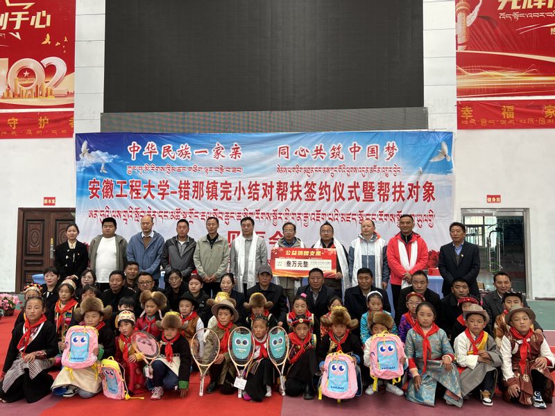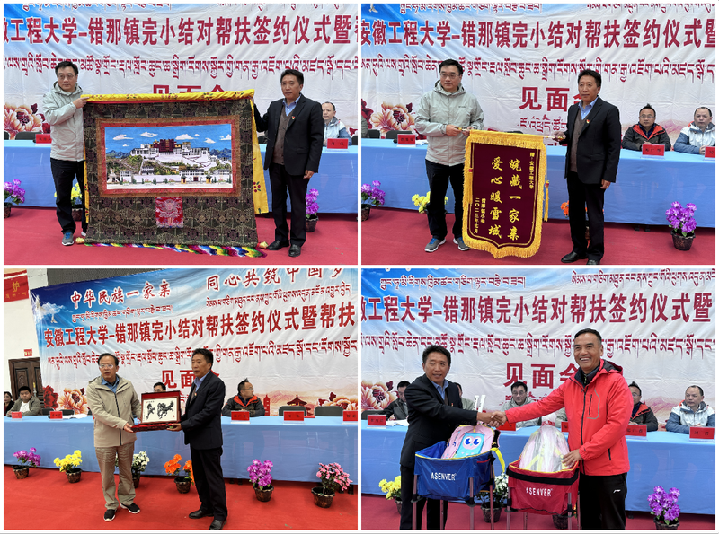 郑健简要介绍学校基本情况、结对帮扶前期筹备情况。2022年11月以来,由校友会秘书处、校工会、校团委牵头,小宝寻花 公益“N+1”志愿服务团队具体对接,小宝寻花 师生校友开始结对帮扶错那镇完小30名藏族学生,共计捐赠帮扶资金6万元以及价值约1万元的御寒、运动装备物资。接下来,小宝寻花 将结合自身实际,努力推动教育帮扶向产业帮扶、技术帮扶扩展,探索“资助结对+特色教育+双向互动”的帮扶路径。校友会秘书长陶玉贵代表学校向错那镇完小捐赠了3万元现金和芜湖铁画。校教职工网球协会活动推广人周毅仁向错那镇完小赠送了由校工会教职工网球协会捐赠的网球运动用品并现场教授网球知识。