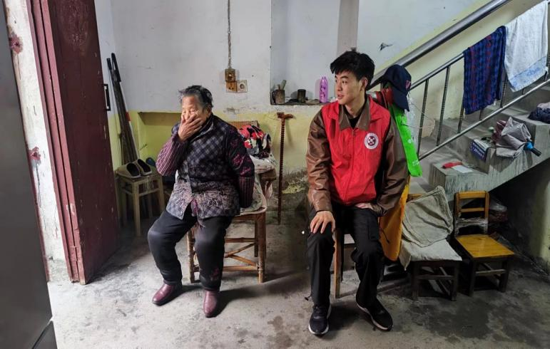 上午八点,志愿者同学已到达社区准备就绪,穿上志愿马甲,领取部分清洁工具,带上米、油、牛奶等生活用品,八名志愿者在社区工作人员的带领下前往老人家中,希望能为老人的生活提供一些便利。老奶奶是个盲人,但听见志愿者同学们的声音,便热情地迎接,脸上也洋溢着幸福的笑容。