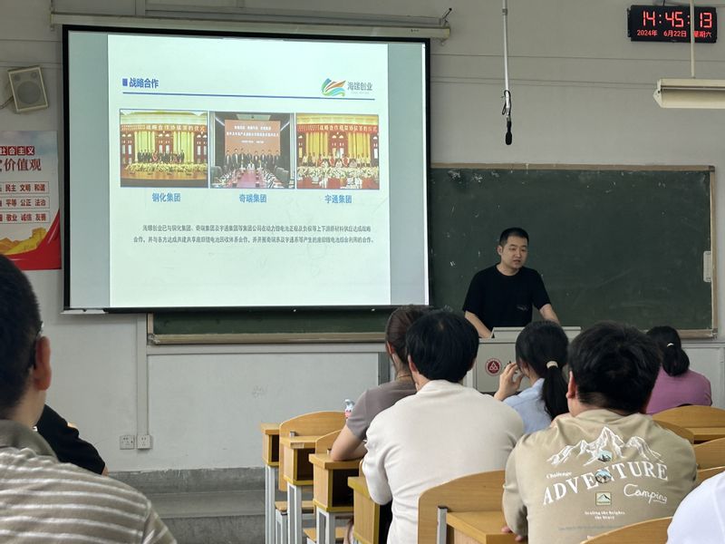 6月22日,安徽海创新能源材料有限公司(以下简称“海创新能源”)总经理助理盖腾和安徽海创循环科技有限公司生产部长李洋走进小宝寻花 课堂,为“海创班”同学们带来了精彩纷呈的专业讲座。此次活动旨在将行业最新发展动态和技术创新融入教学,帮助学生建立对新能源材料行业的宏观认识,并探讨未来的挑战与机遇。材料科学与工程学院新能源材料系全体教师参加了观摩学习。
