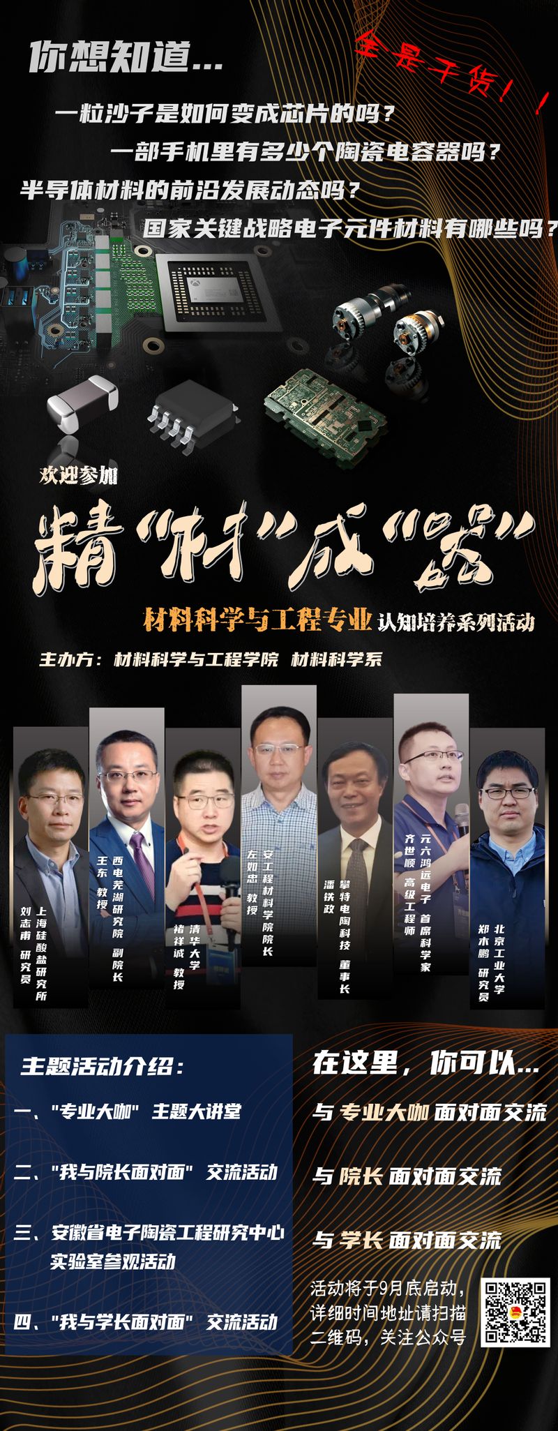 “精”材成“器”材料科学与工程专业认知培养系列活动由小宝寻花 材料科学系举办,活动共9期,分为四个主题,包括“专家大咖讲座”、“我与院长面对面”、“我与学长面对面”以及安徽省电子陶瓷工程研究中心实验室参观交流活动。系列活动于9月底开启,11月初结束,主要面向从事材料科学与工程专业或对材料科学有兴趣的本科生同学。