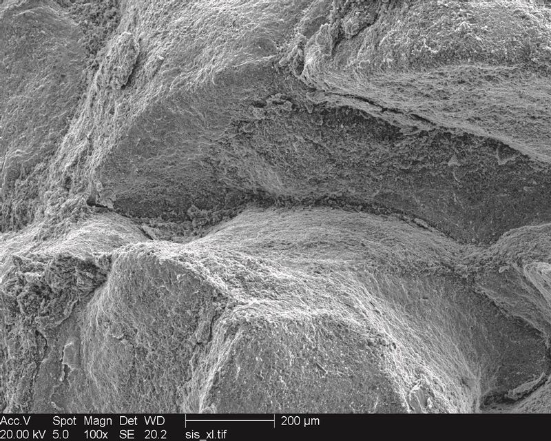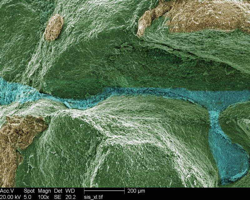 作品名称:峡谷奇景—短碳纤维增强镁基复合材料。材料:短碳纤维增强镁基复合材料。仪器:JSM-7000 F扫描电子显微镜。描述:此微结构照片为镁合金屑与碳纤维经过球磨、压断后,经扫描电子显微镜(SEM)放大100倍后观察断面获取,拍摄于2022年初。碳纤维增强镁基复合材料具有比强度高、硬度高和重量轻等优点,在交通运输、建筑工程等领域具有良好发展前景。图中复合材料形貌好似从天上落下,自西向东流,却止步于峡谷东侧。唯有《望天门山》贴切形容峡谷景色。水流在逼仄的通道内激荡,与石壁对抗,两者对抗又平衡着。峡谷的景象下还藏着故事。古时候,天上的水神因被凡间美景所吸引,决定下凡间游玩。然而,他游玩的过程中,却不断地留下沟壑和洪水,给凡间带来了巨大的灾难。玉帝得知此事后便派下神山,用来阻挡水神的脚步。最终,水神无法再向前推进。而神山也留下了伤痕,内部凹陷中空,成为了峡谷。