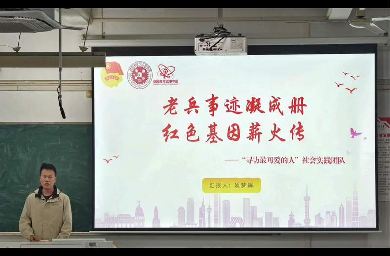 “寻访最可爱的人”社会实践团队项梦辉,以“老兵事迹凝成册,红色基因薪火传”为主题进行介绍。红色基因是民族灵魂,是精神支柱。在漫长的历史长河中,革命先烈用生命和鲜血谱写了英雄赞歌,才有今天的繁华盛世,团队秉持着“感悟红色精神,汲取红色力量”的原则,采访芜湖优秀退伍老兵,在与老红兵们的切身谈话中,团队成员深刻感悟国防教育、爱国和集体主义精神,传承红色基因,把对老兵的敬意转化工作的动力和积极性,开拓创新,为强国建设、民族复兴伟业添砖加瓦增光添彩。