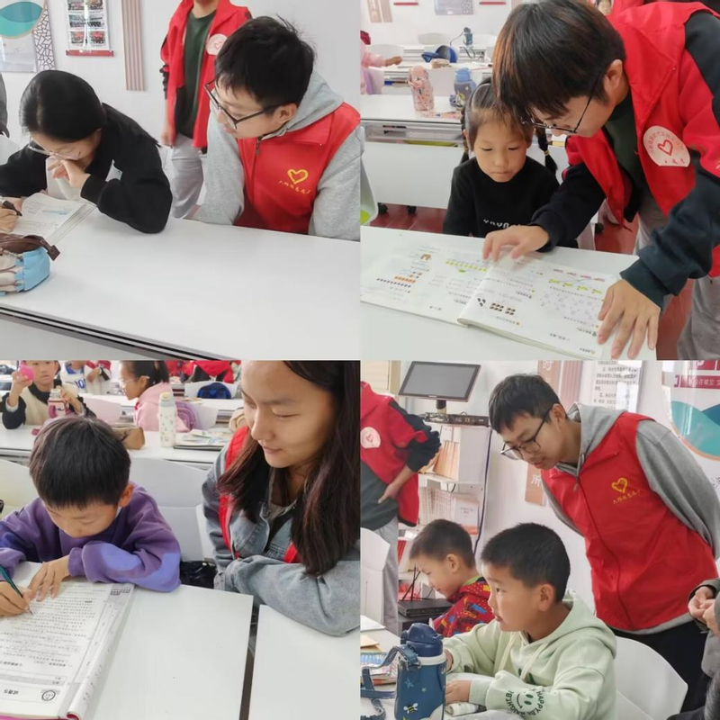 早上8:00,志愿者们穿着统一的志愿者服装,面带温暖的笑容准时到达活动现场。在队长的组织下,他们仔细检查小朋友们的课后作业,帮助他们解决难题,耐心指导、细心解答,培养小朋友们积极思考、主动学习的良好习惯。