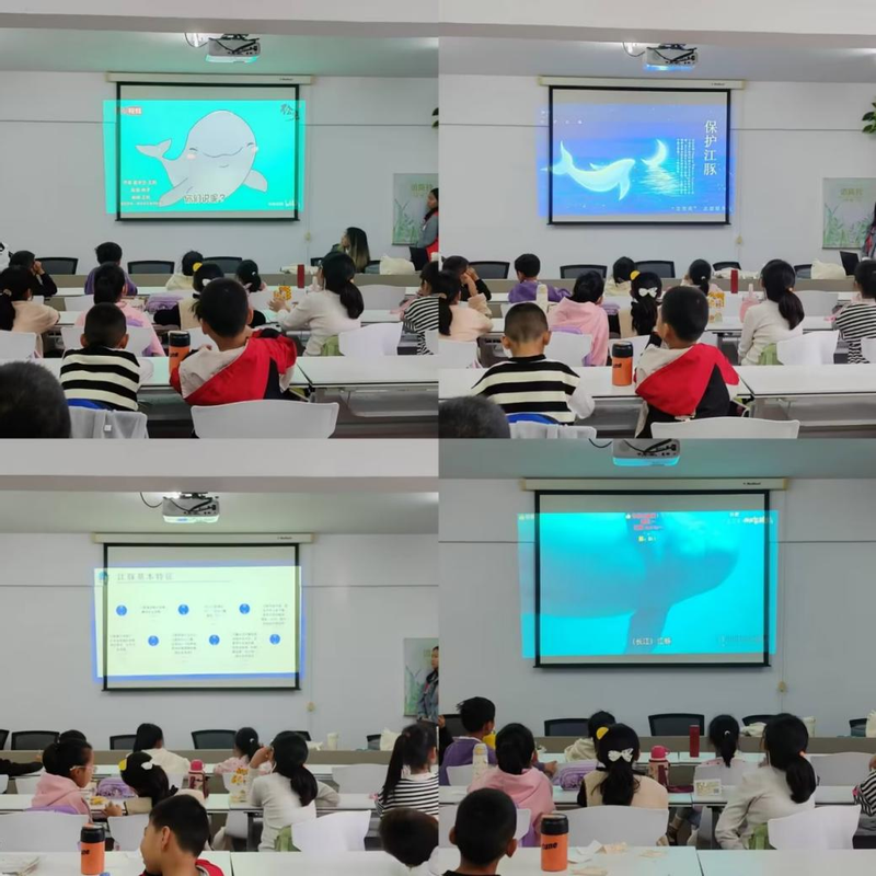 功课辅导结束后,志愿者们向小朋友们介绍了中国的江豚,播放精心制作的科普短片,志愿者们向小朋友们详细讲解了长江江豚的外形特征、生活习性以及目前所面临的生存挑战。在互动环节中,小朋友们积极举手参与问答,对长江江豚的知识表现出了极大的兴趣。