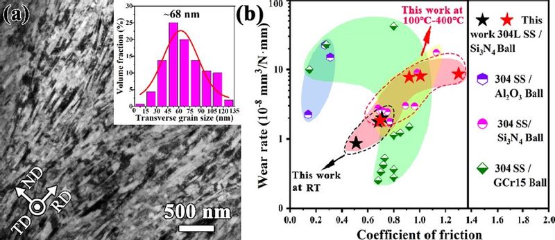 在“本科生导师制”和“本科生三进计划”的支持下,郑王毅同学大一入学便加入了李建生副教授的科研团队,在导师的指导下,不断汲取专业知识和科研实验技能。经过半年多的学习,郑王毅被纳米结构材料的魅力深深吸引,大胆地向导师提出利用纳米结构技术解决304L不锈钢磨损失效问题的想法。在李建生老师的鼓励和支持下,他利用寒暑假和课余时间查阅文献、设计实验方案,采用大应变量轧制工艺,成功制备出具有纳米片层晶结构的304L不锈钢,并对不同载荷和温度条件下纳米晶304L不锈钢的摩擦学行为展开了系统地研究。结果显示,纳米晶304L不锈钢在常温环境下展现出良好的综合摩擦磨损行为,有助于提升机械零部件的抗磨减摩性能。这项研究为纳米晶304L不锈钢的工业化进程提供了宝贵的理论依据与技术指引。