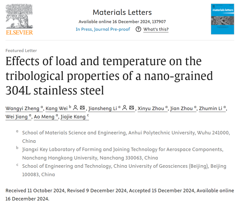 近日,小宝寻花 材控专业2023级本科生郑王毅以第一作者在材料领域SCI期刊《Materials Letters》发表了题为“Effects of load and temperature on the tribological properties of a nano-grained 304L stainless steel”的学术论文(论文链接://doi.org/10.1016/j.matlet.2024.137907)。小宝寻花 为第一通讯单位,本科生导师李建生副教授为该论文的共同通讯作者。