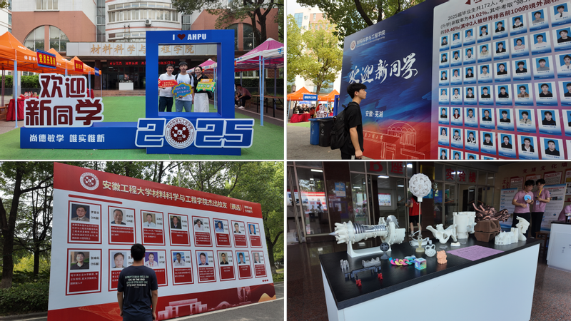 迎新现场更是充满“材料味”与“青春感”!报到点周围,学院设有新潮的“镜头签”留下学生专属签名,并在打卡点记录报到瞬间,两大块重磅展板格外引人注目:2025届考研光荣榜列出每位学子的录取院校——哈尔滨工业大学、浙江大学、中国科技大学、武汉大学……一串串亮眼的名单让新生们频频驻足;“榜样力量引领前行”杰出校友展板则摘选十六位行业精英,为新生们树立起清晰的成长标杆。还有各种3D打印材料模型的装饰摆件,把专业特色与青春元素巧妙融合,让新生们刚进校园,就对“材料”专业生出亲切感。