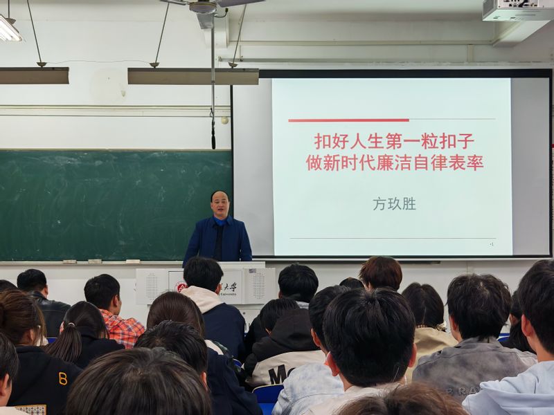 随后,方玖胜还做了题为《扣好人生第一粒扣子,做新时代廉洁自律表率》的专题报告。他指出,廉洁自律不仅是党员干部的基本要求,也是每一位青年学子应当自觉践行的行为准则,它关乎个人的成长成才,更关系到国家和民族的未来。他强调,在新时代背景下,面对复杂多变的社会环境和诱惑,青年一代更应坚守初心、廉洁奉公,以高尚的品德和坚定的信念,成为引领社会风气的先锋和表率。