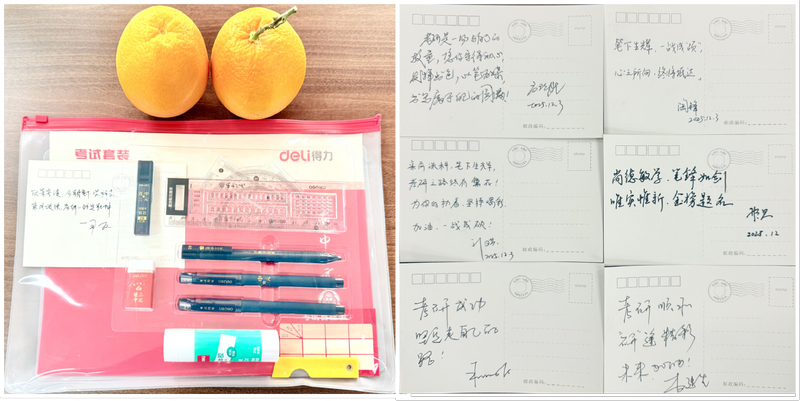 随后,与会领导老师们为学子分发精心筹备的“考研慰问包”。慰问包内含实用文具与能量零食,承载着学院心想事“橙”的美好祝愿,让学子深切感受到关怀与温暖。