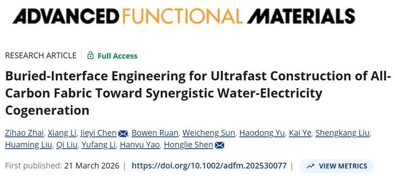 论文信息:Zihao Zhai, et al. Buried-Interface Engineering for Ultrafast Construction of All-Carbon Fabric Toward Synergistic Water-Electricity Cogeneration. Advanced Functional Materials, 2026. DOI: 10.1002/adfm.202530077